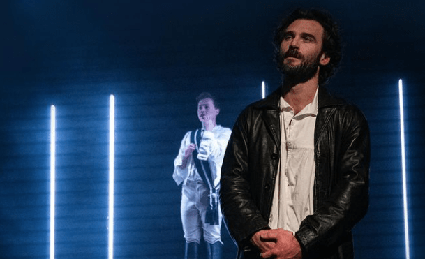 The King’s Head Theatre works perfectly for the piece. The staging is appropriately intimate with the performance space set into a thrust with audience at three sides. The aesthetic on stage is minimal with four moveable upright LED strips utilised to create various locations on stage. It is a clever concept which creates powerful visuals, whilst successfully indicating shifts in location with quick transitions. However, despite the effective simplicity of this design, the atmosphere sometimes felt interrupted by actors moving LED strips during a scene change, leaving some scenes feeling disjointed as a result. This simple but successful design, along with J. Aria’s evocative sound design, helps to connect the content to the modern day. Through the narrative we balance on the cusp of both the 19th century and modern day, with the costumes leaning into the regency of the piece, but bass-y club music transporting us into the present; the more moving moments such as the beginning and especially the epilogue of the play are perfectly punctuated by J. Aria’s stirring soundscapes.