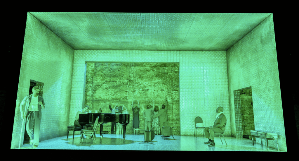 ‘I’m not living with you. We occupy the same cage.’ Declares Maggie in Act One. There is a feeling of claustrophobia permeating from the characters – each of them repressed and fighting to break out. Chloe Lamford’s set design mirrors this feeling wonderfully: the action is encased in a metallic-plated box, reflecting the current lighting state (which largely remains cold and white, save for a few visually explosive moments of colour). Behind this, the half-crumbled wall of the Almeida stands, exposed by this set and creating a striking contrast between the smooth silver of Brick and Maggie’s room against a decaying backdrop of America’s Deep South on the precipice of change.